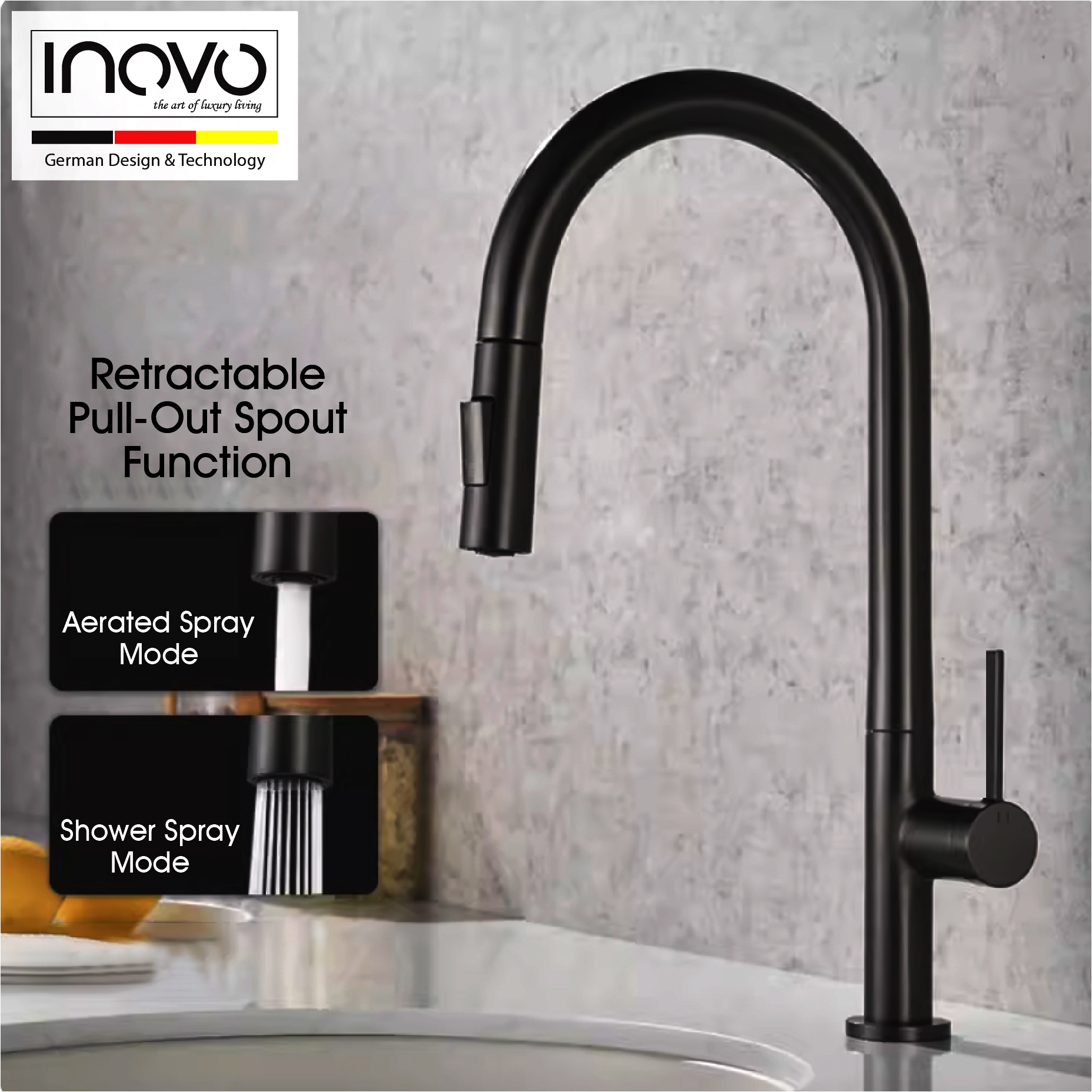 Combining modern style with smart design features, this INOVO Cosimá kitchen tap faucet has a distinctive shape that enhances contemporary decor. The high-arch swing spout makes way for your largest pots and pans, and the pull-out sprayhead allows for more effective cleaning and up-close tasks. At the touch of a button, the sprayhead switches from an aerated stream to a powerful spray to a convenient pause function. The ergonomic single side lever offers easy control of water temperature and pressure.